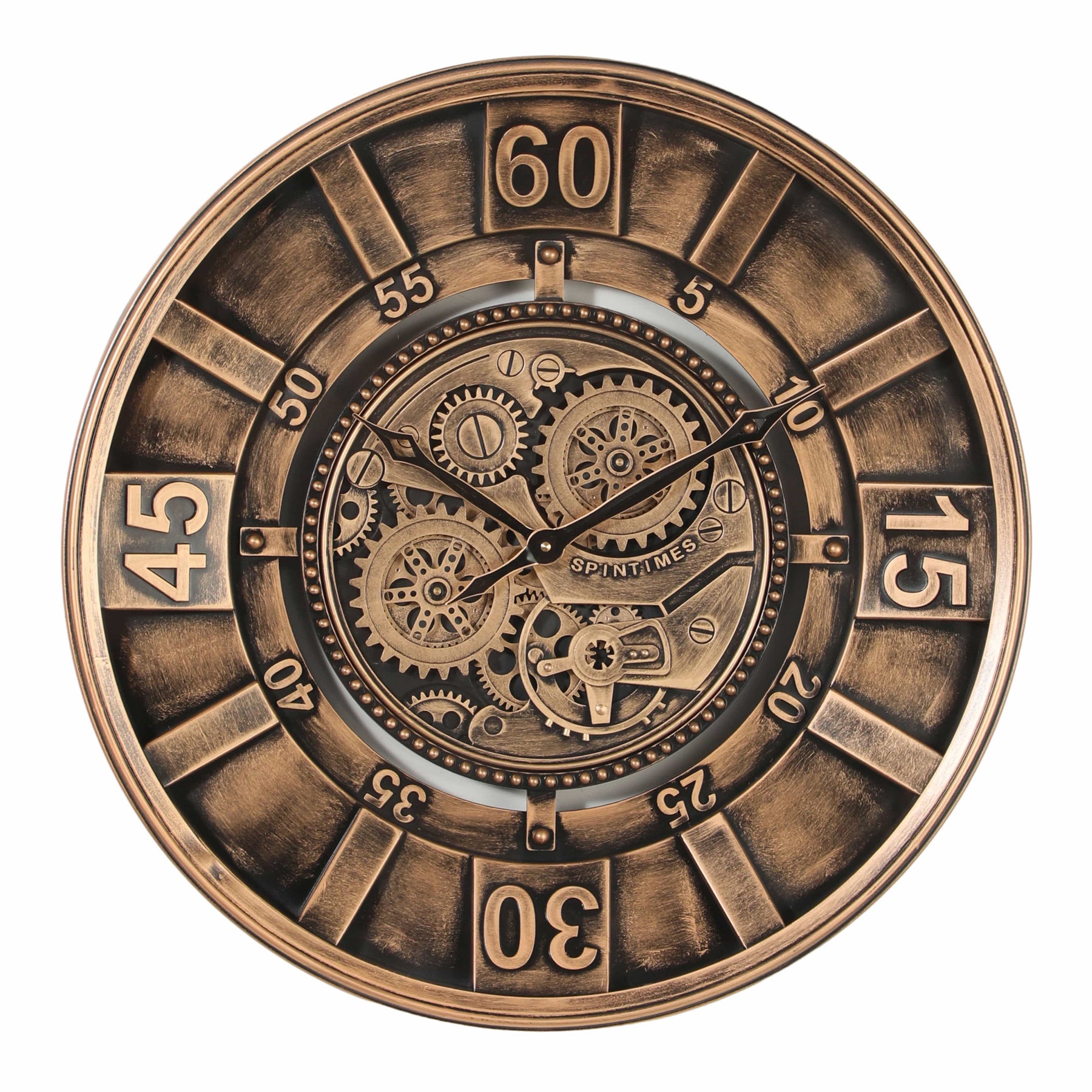 Inspired by industrial design, this wall clock beautifully showcases mechanical elements. Its unpolished finish offers a neutral look, while visible inner mechanisms and cut-out details add visual interest. The frame is pure metal with an antique powder-coated finish. The exposed gears let you see the clock's inner workings and drive the slender black hands with rhythmic motion. A thick, high-quality glass cover protects both the clock face and the gears.