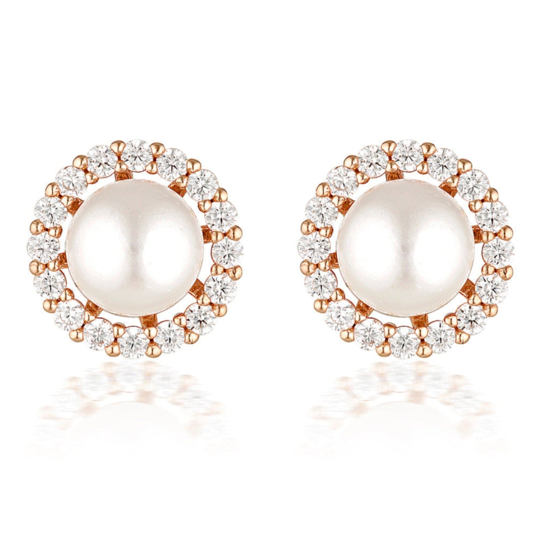 Georgini's Noel Nights Esteem Pearl Earrings, crafted from 18ct Rose Gold plated 925 Sterling Silver, feature a stunning shell-based pearl and a removable halo, allowing you to customize your look with necklaces, pendants, bracelets, and rings. These popular and timeless earrings are a perfect addition to any outfit, measuring 10.4mm wide.