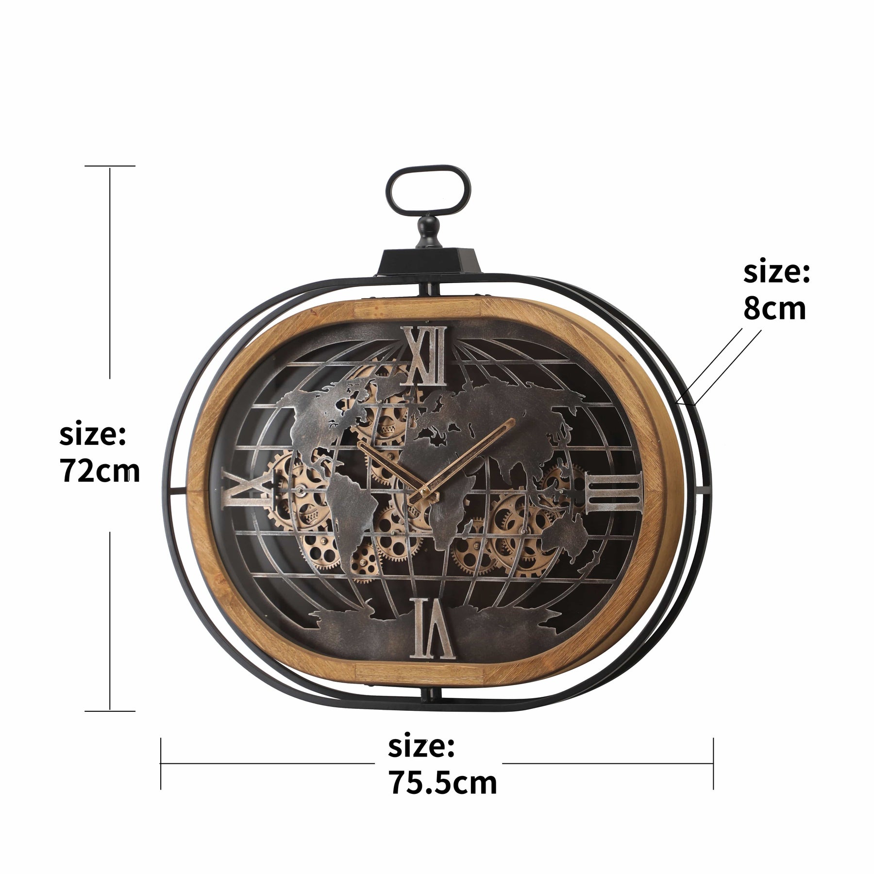 The frame, crafted from pure metal, contrasts beautifully with the warm wooden inner board, giving this clock a charming country feel. The clock face showcases a cut-out world map alongside essential time increments. With its exposed gear movement, you can admire the intricate inner workings, while the rotating gears drive the sleek black hands. This wall clock not only tells time but also serves as a stunning focal point, perfect for any space where time and style converge.