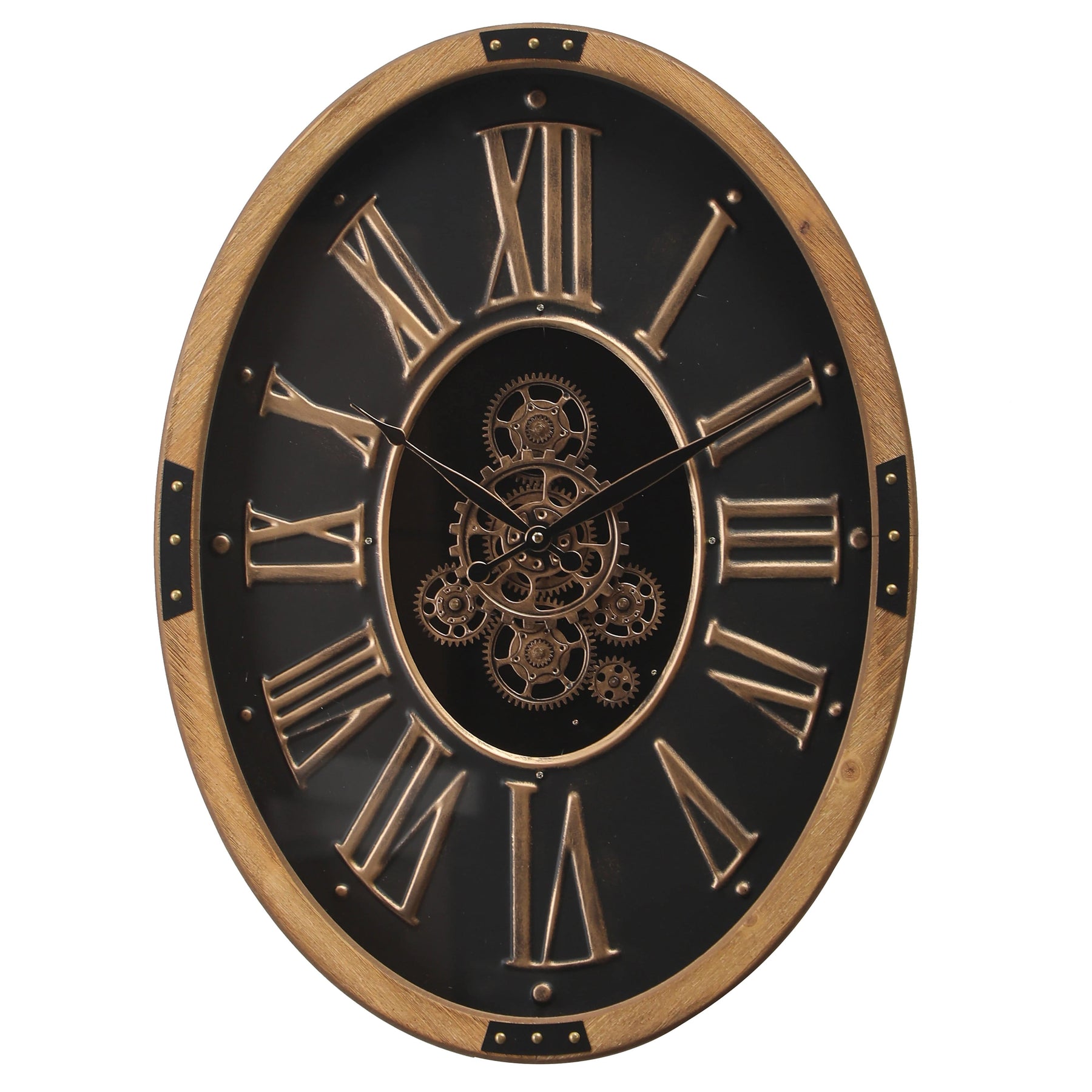 This stylish wall clock combines a natural, modern look with mechanical charm. Made from solid wood with black and silver metal accents, it features an unpolished finish and bold golden Roman numerals. The exposed gear movement allows you to view the clock's inner workings.