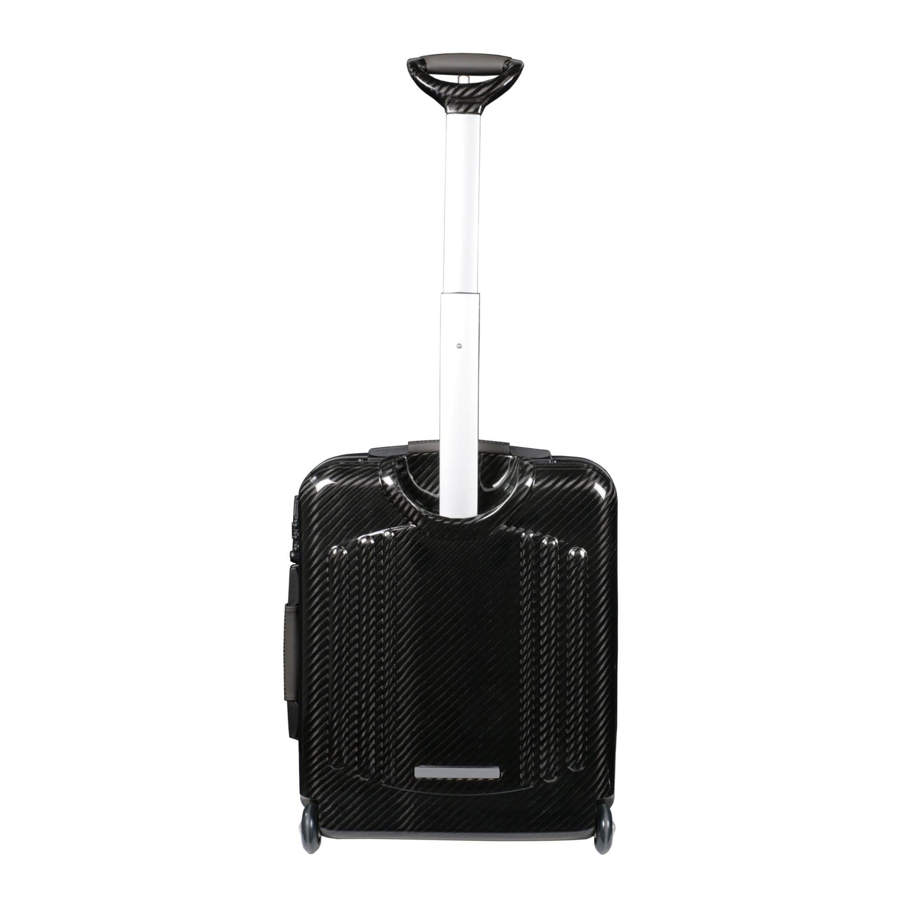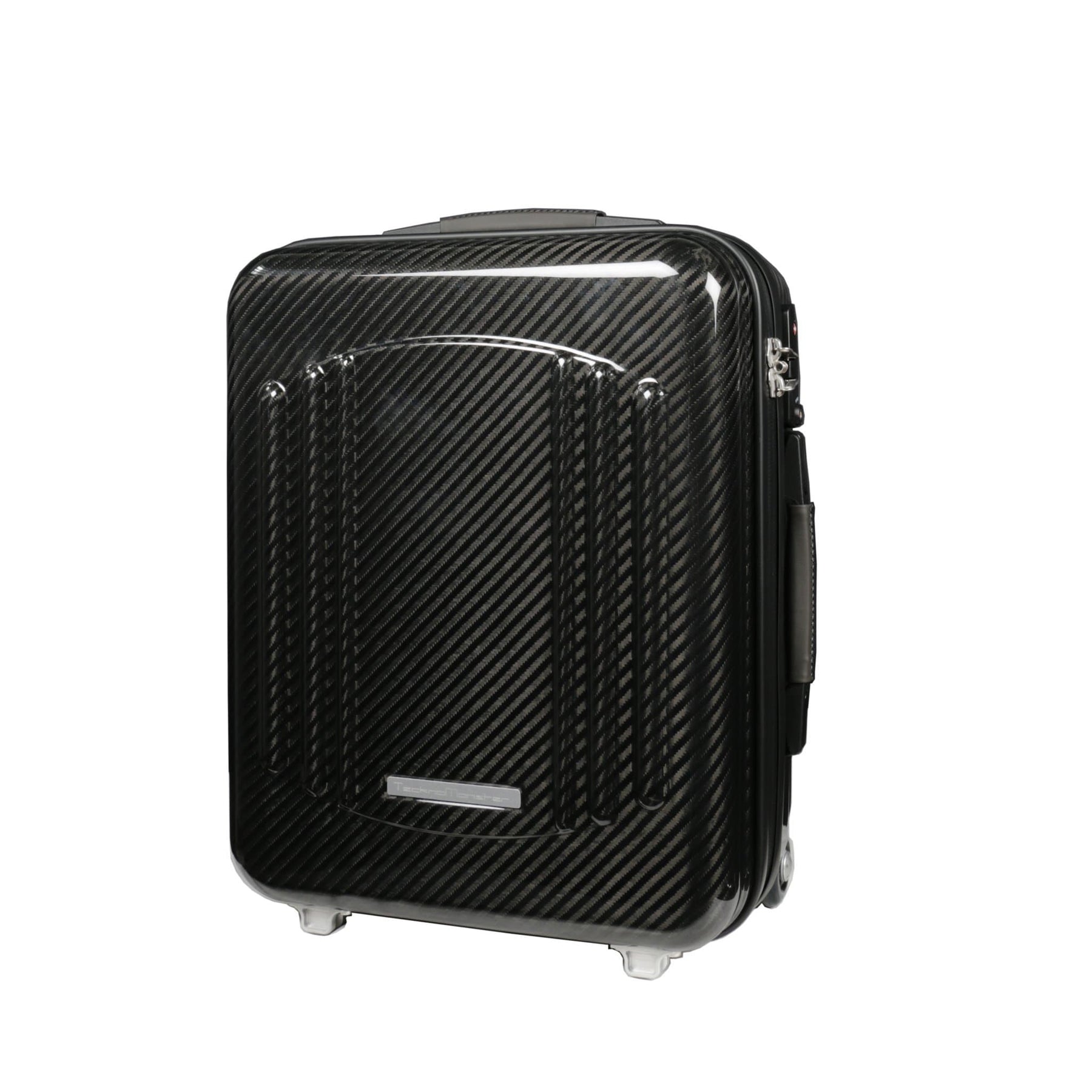 Tecknomonster Elfodue small Cabin Trolley, 2 wheels in Glacies Carbon fiber autoclaved monocoque, with zippered closure. Very resistant wheels supports in aluminum, 360° pivoting, ultra silent. Telescopic handle 3 stages. Super lightweight, strong and the original Curv technology Trolley. Aeronautical carbon fibre suitcase Made in Italy.