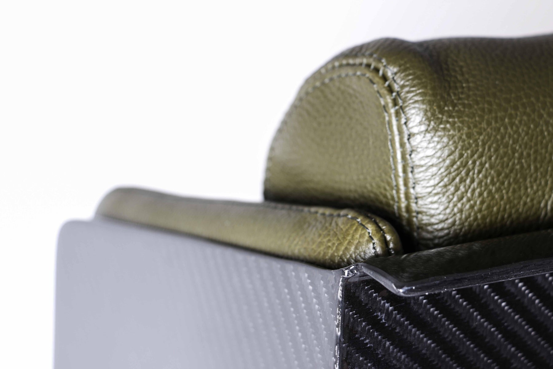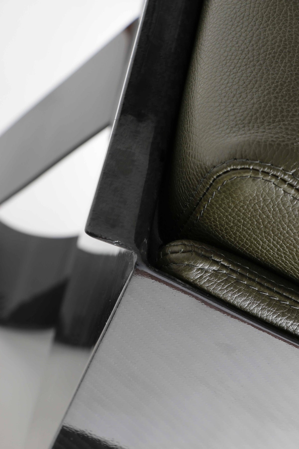 Full carbon monocoque fibre armchair with glossy finishing, cooked in autoclaves and assembled with aerospace technologies. Genuine leather cuscions in dark green.