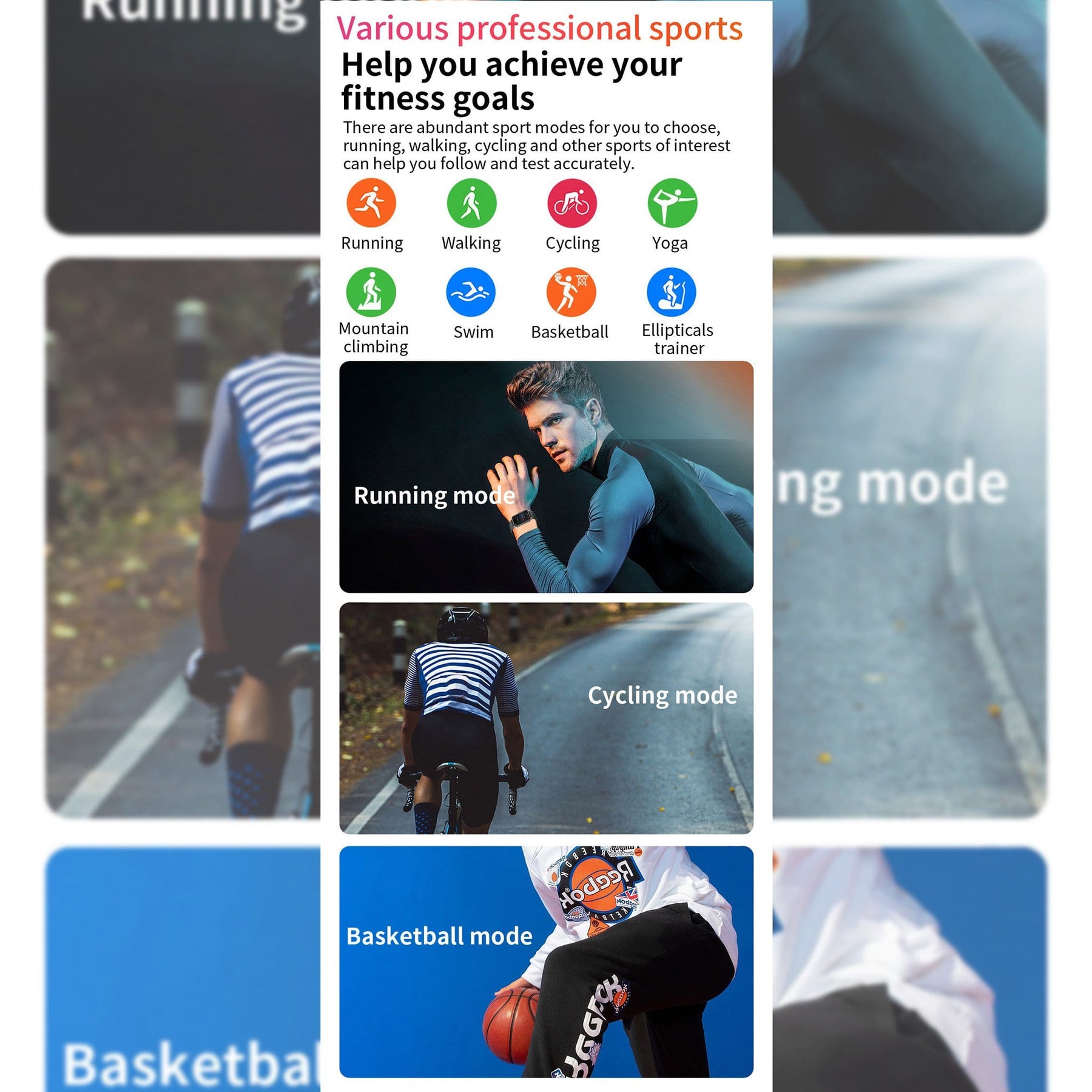 Time, Pedometer, CalorieConsumption, DistanceCalculation, Sleeptime, Standardexercisesfunctions(Walking, Running, Cycling, Swimming, Basketball), Calls to remind, SMSReminder, Third-party messaging reminder, Multilingualpush, TaskReminder, Sedentary reminder